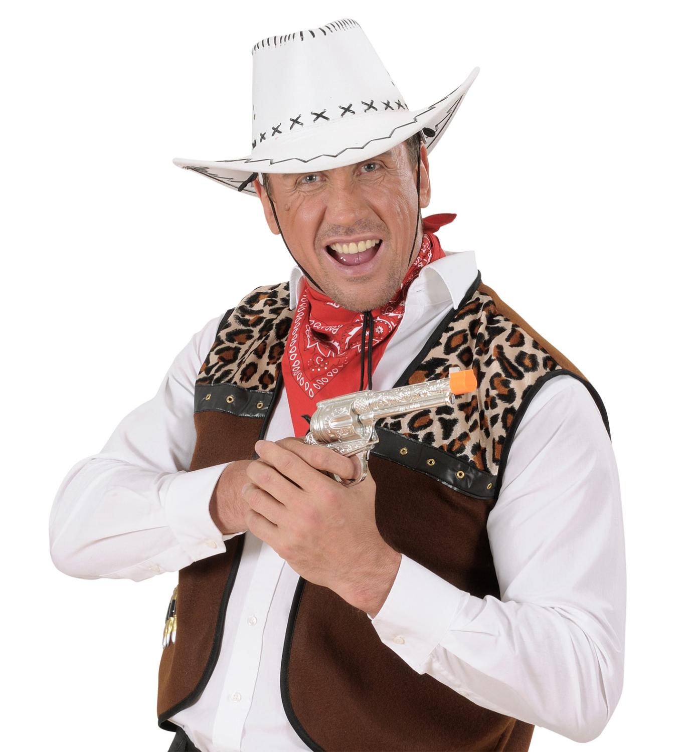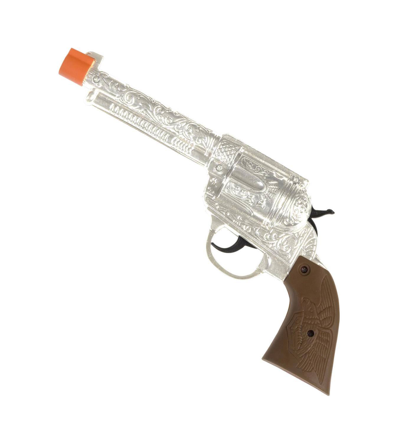 Cowboy pistol i silver med brunt handtag. Pistolen hade alla Cowboys på prärien under 1800-1900 talet.Farorna var många som lurade på prärien och pistolen var viktig för att kunna försvara sig.