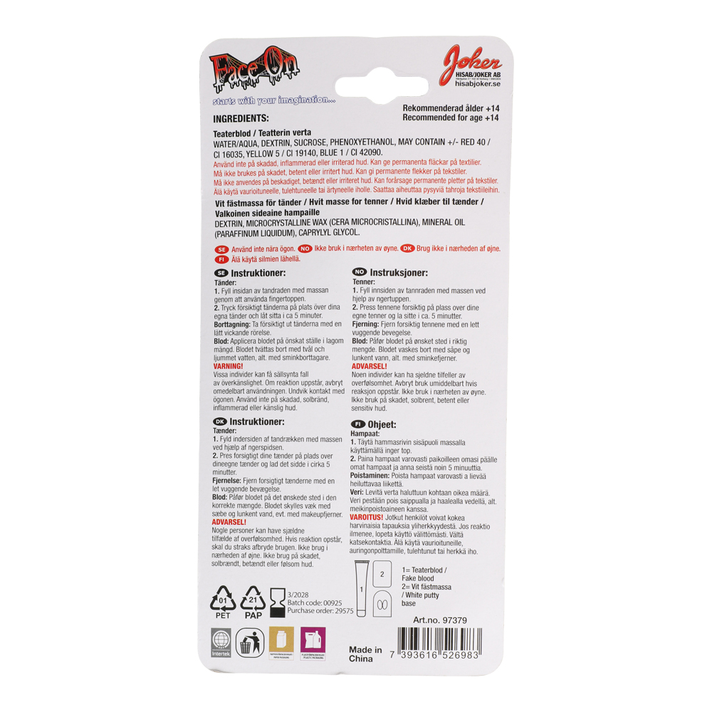 Förvandla dig till en äkta vampyr på ett ögonblick! Setet innehåller realistiska vampyrtänder och blod för den perfekta blodtörstiga looken. Enkelt att använda och perfekt till Halloween, maskeraden eller skräckfesten.